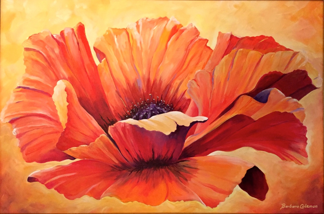 “Happy Poppy” is the first is a series of three macro flower paintings. Macro is a magnified point of view, as if you are close enough to smell the flower. This is an oriental poppy that attracted me because of it’s striking dark center. It was painted in the middle of the summer and the bright colors and curling petals just made me happy!